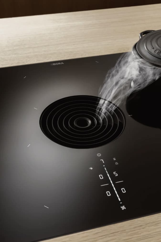 La table de cuisson induction présente quatre larges zones de cuisson rondes exploitant entièrement la profondeur de 51,5 cm. BORA Pure s’adapte aux meubles de 80 cm de largeur.
