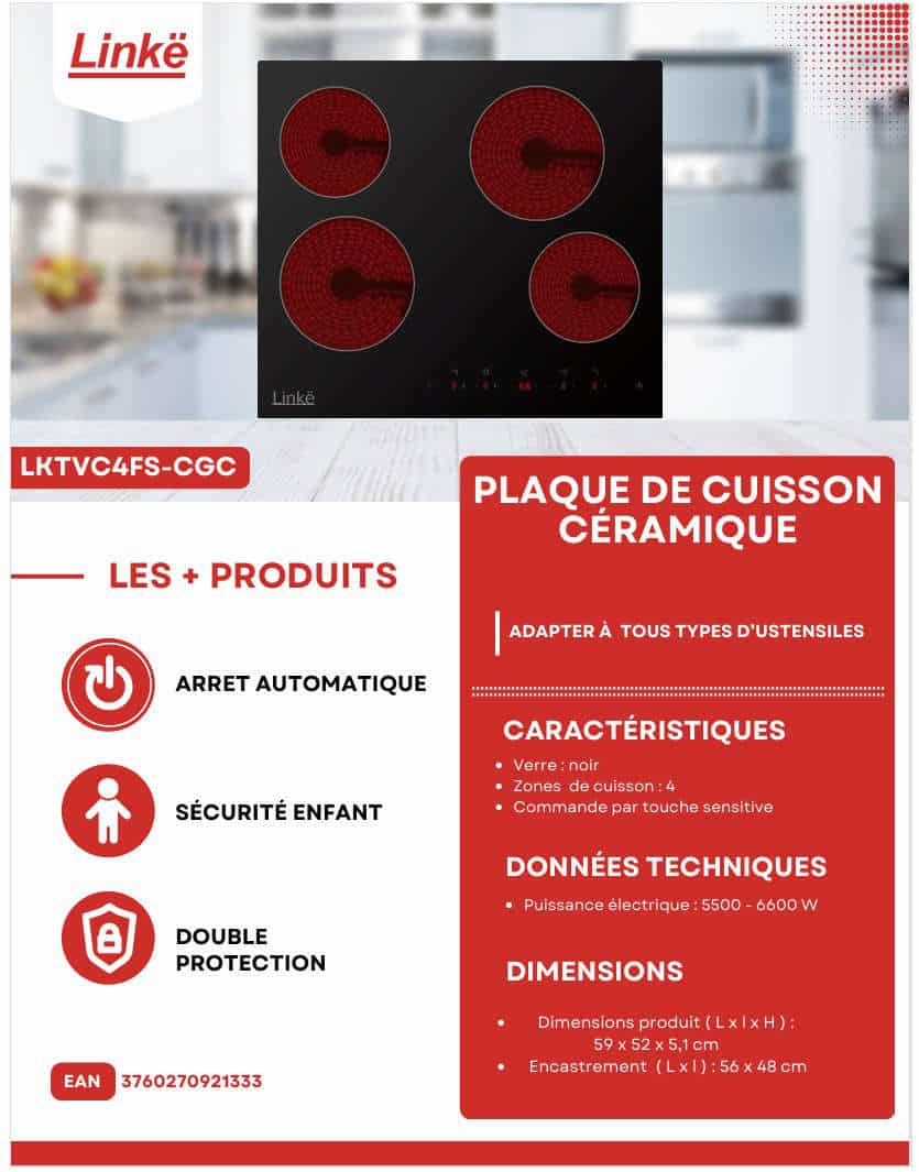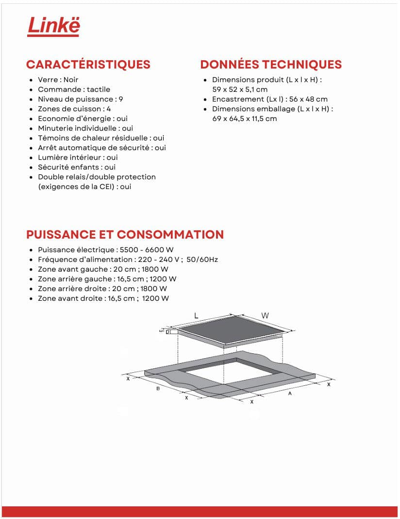 Optimisez votre espace de cuisine avec la plaque vitrocéramique Linkë, une solution de cuisson alliant élégance et haute performance. Dotée d’un revêtement en verre noir moderne, elle s’intègre parfaitement dans tout type de plan de travail grâce à ses dimensions d’encastrement standards de 56cm X 48cm. Cet appareil polyvalent dispose de 4 zones de cuisson offrant une puissance totale allant jusqu’à 6600 W, permettant une gestion précise de vos cuissons sur 9 niveaux de réglages via une commande par touche sensitive intuitive.